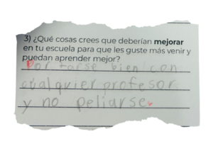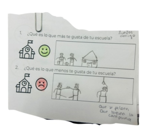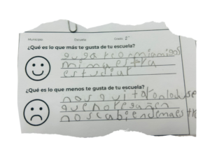 - Las y los estudiantes compartieron su opinión sobre lo que les gusta y disgusta de su escuela, además de qué es lo que les gustaría mejorar de ésta. Destacan que jugar con las y los compañeros –ya sea al fútbol, con diferentes juguetes y en los juegos infantiles de exterior–, así como estar en el patio y el recreo, y convivir con sus maestras y maestros, son las actividades que más disfrutan dentro de la escuela.